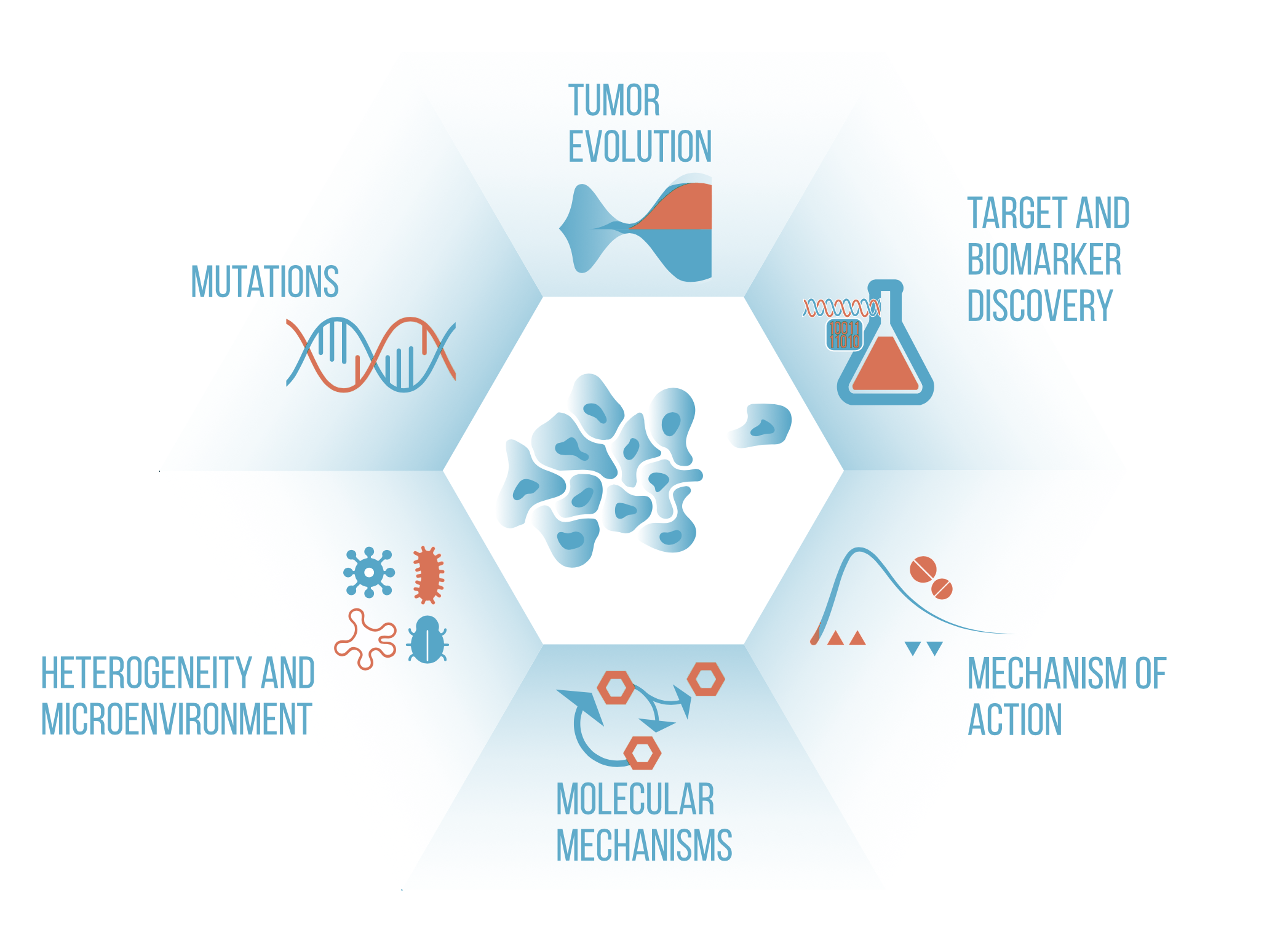 Our expertise in cancer biology spans fundamental research into a variety of high-throughput molecular data types and cancer types. We have investigated heritable and somatic variants and their downstream molecular effects, as well as the evolution and microenvironment of tumors, to name just a few aspects of cancer biology, along with our partners and clients.